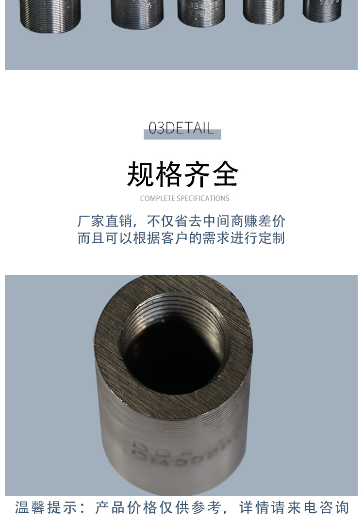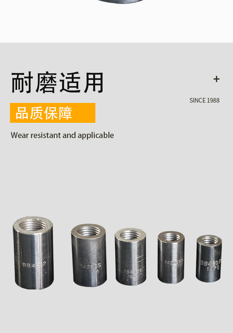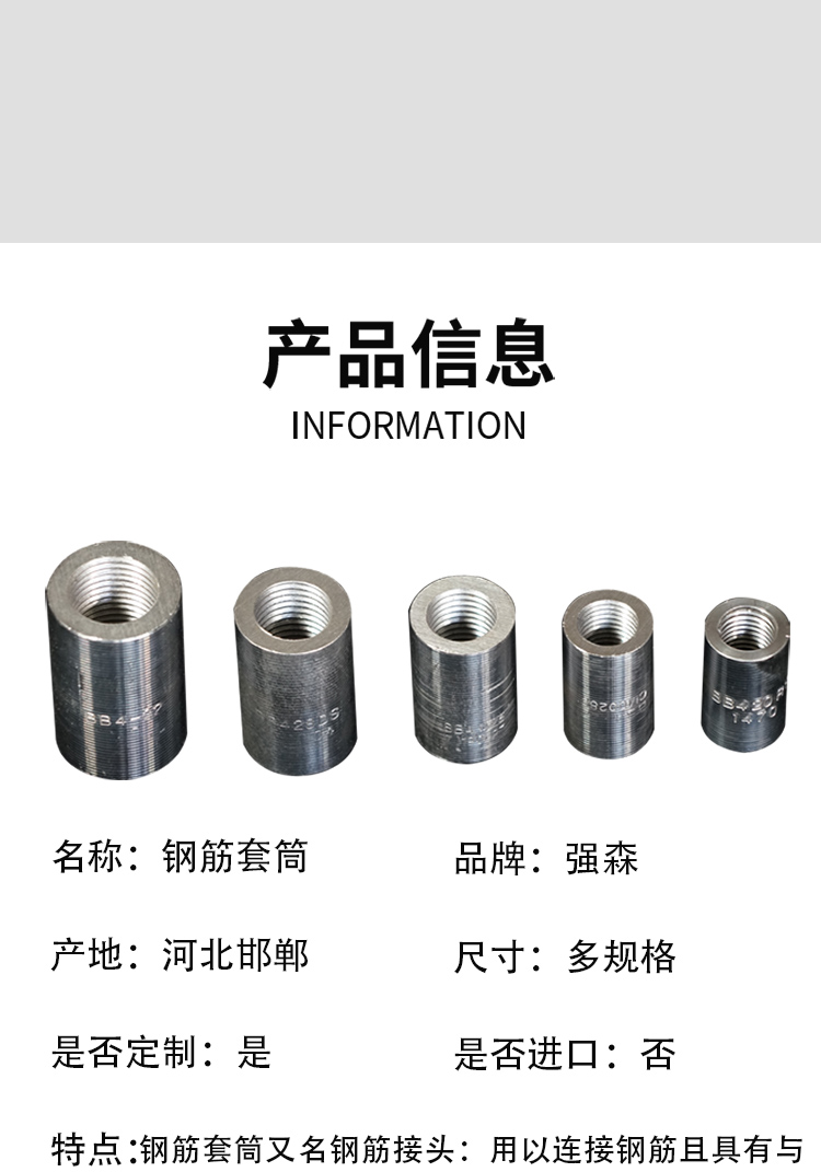 鋼筋套筒又名鋼筋接頭:用以連接鋼筋且具有與絲頭螺紋相對(duì)應(yīng)內(nèi)螺紋的連接件。簡(jiǎn)單的施工流程:將鋼筋端部用滾軋工藝加工成直螺紋,并用相應(yīng)的連接套筒將兩根鋼筋相互連接。鋼筋套筒通常是用精密鋼管進(jìn)行生產(chǎn)的。專(zhuān)門(mén)用于生產(chǎn)鋼筋套筒的精密鋼管采用的是45#鋼材,通常又被稱(chēng)為“鋼筋連接套管”。鋼筋套筒***可靠,連接方便,便于檢測(cè)。